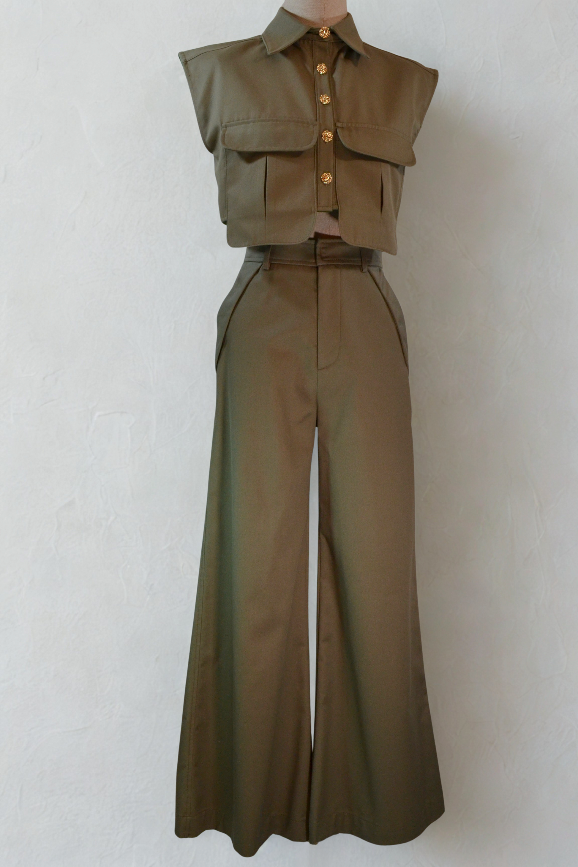 Pantalón de corte ancho en tono verde militar. Cuenta con pretina ancha con trabillas para cinturón, cierre oculto al frente y bolsillos laterales tipo diagonal que aportan comodidad y practicidad.