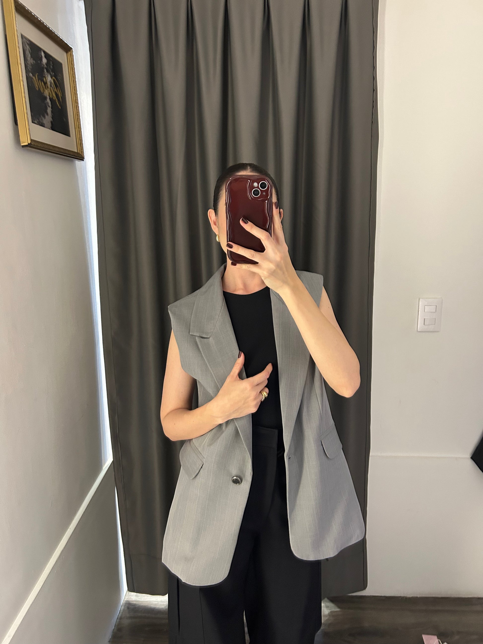 Este chaleco tipo sastre está confeccionado en una tela estructurada con caída ligera que realza la figura sin perder movimiento. Presenta solapas anchas, cierre frontal con botón y bolsas delanteras funcionales con tapa, ideales para un toque práctico y sofisticado.