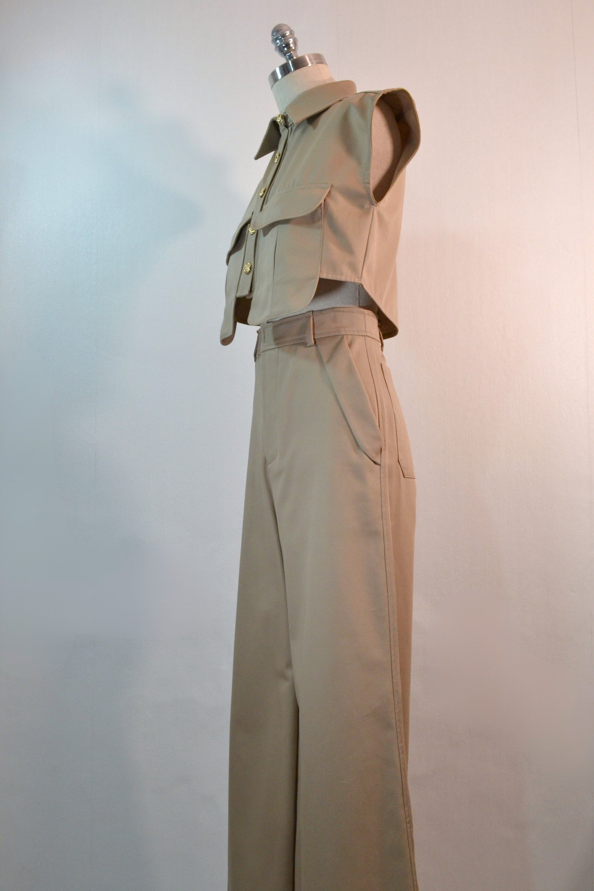 Pantalón de corte ancho en tono caqui. Cuenta con pretina ancha con trabillas para cinturón, cierre oculto al frente y bolsillos laterales tipo diagonal que aportan comodidad y practicidad.